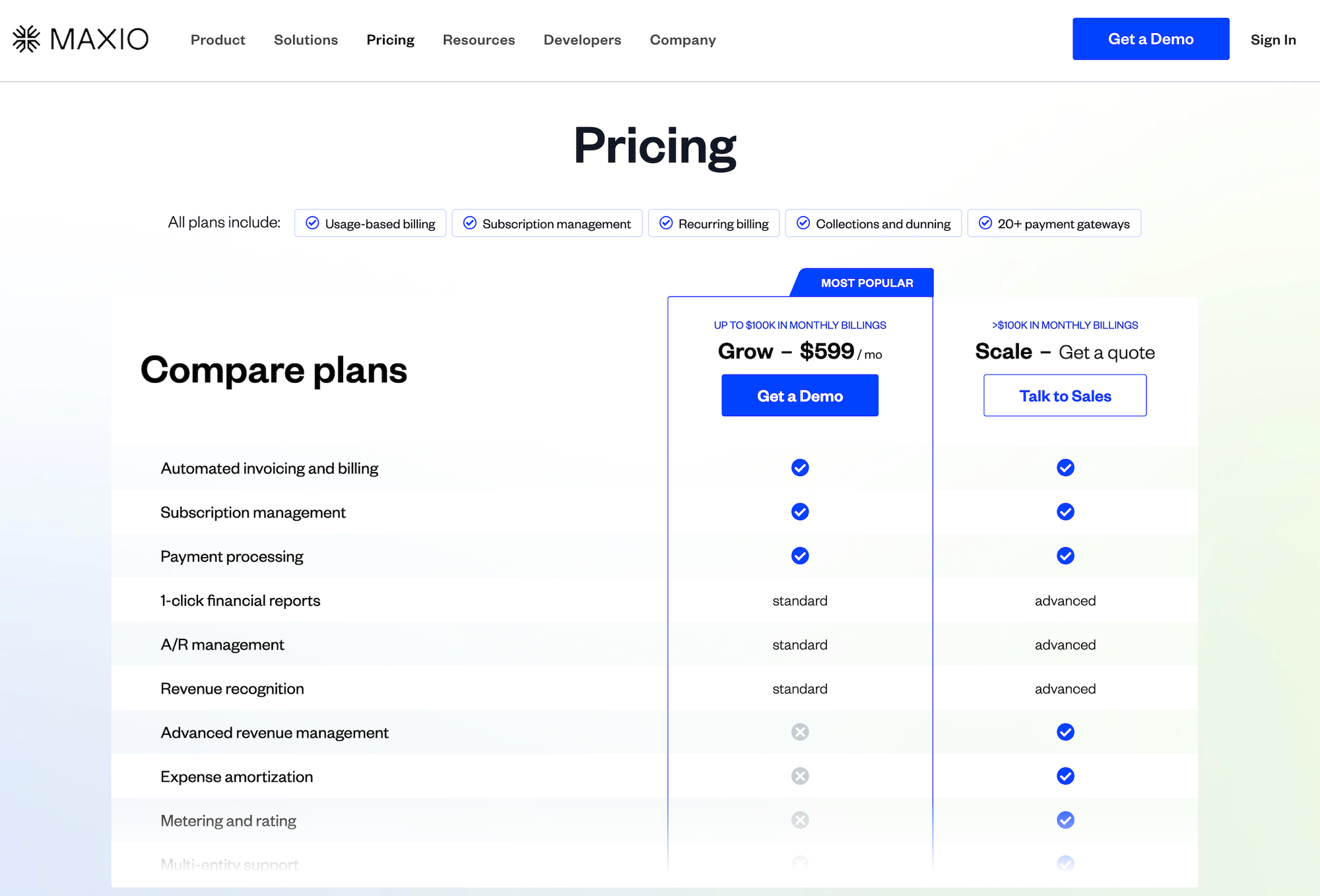 Maxio’s pricing is customized to the client’s size and needs. It generally involves an annual subscription fee that can scale with the volume of billing (ARR or number of invoices/customers) and which modules are activated (billing, CPQ, revenue recognition, analytics).